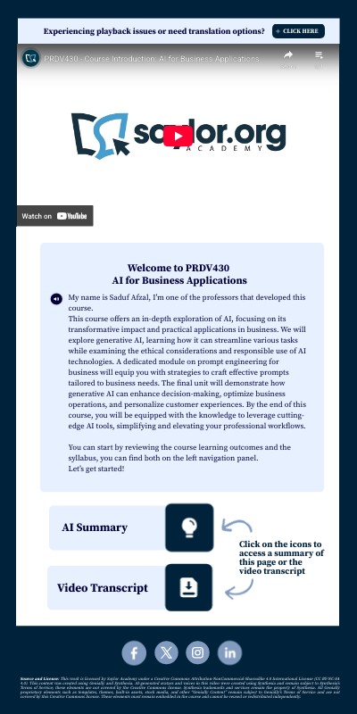 My name is Saduf Afzal, I’m one of the professors that developed this course. This course offers an in-depth exploration of AI, focusing on its transformative impact and practical applications in business. We will explore generative AI, learning how it can streamline various tasks while examining the ethical considerations and responsible use of AI technologies. A dedicated module on prompt engineering for business will equip you with strategies to craft effective prompts tailored to business needs. The final unit will demonstrate how generative AI can enhance decision-making, optimize business operations, and personalize customer experiences. By the end of this course, you will be equipped with the knowledge to leverage cutting-edge AI tools, simplifying and elevating your professional workflows. You can start by reviewing the course learning outcomes and the syllabus, you can find both on the left navigation panel. Let’s get started!