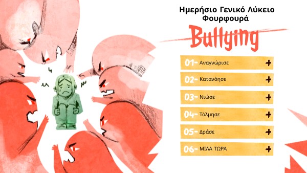 Η δράση είναι το επόμενο βήμα. Μίλα σε έναν δάσκαλο, σύμβουλο, φίλο ή γονιό. Στήριξε κάποιον που υποφέρει, οδήγησέ τον σε βοήθεια, κράτησε τον ασφαλή. Κάθε μικρή πράξη μπορεί να σταματήσει τον εκφοβισμό και να κάνει το σχολείο πιο ασφαλές για όλους. Η σιωπή επιτρέπει τη βία. Η δράση δημιουργεί αλλαγή.