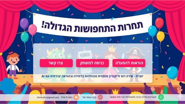 שלב 1: כניסה ראשונית של מנהל התחרות ויצירת חדר היכנסו לקישור. במסך הלבן, הזינו קוד חדר, לחצו על כפתור הקוביות להגרלת קוד ואז על הכפתור "כניסה לתחרות". שלב 2: כניסה למצב מנהל/ת כדי לשלוט בתחרות, לחצו על אייקון המנעול שמופיע למעלה משמאל. הקישו את הסיסמה הסודית: 2025. עכשיו ייפתח לכם לוח הבקרה הצהוב בראש המסך. שלב 3: שליחת קישור לתלמידים והקרנה שלחו לתלמידים את כתובת אתר התחרות הנחו את התלמידים שבמסך הראשון שיפתח להם, עליהם להזין את קוד החדר שהקרנתם להם על המסך כדי להתחבר לתחרות הכיתתית. הצגת הקוד: בלוח הבקרה תראו כרטיס צהוב קטן עם קוד החדר. לחצו עליו כדי להגדיל אותו למסך מלא! כך המשתתפים יוכלו לראות את הקוד ולהצטרף בקלות. שלב 4: העלאת התחפושות ודאו שהמערכת נמצאת במצב "העלאה" (זהו מצב ברירת המחדל). בשלב זה המשתתפים מעלים את שמם, את שם התחפושת ואת תמונת התחפושת. בלוח הבקרה תוכלו לראות בזמן אמת במונה את מספר המשתתפים שכבר העלו תמונות. שלב 5: הצבעה כשכולם סיימו להעלות תמונות, לחצו בלוח הניהול על כפתור "הצבעה". המשתתפים יראו בצג שלהם את כל התחפושות ויוכלו לבחור מקום 1, 2 ו-3. בלוח הניהול יופיע מונה המראה כמה משתתפים כבר סיימו להצביע. שלב 6: חשיפת התוצאות לחצו על כפתור "תוצאות". על המסך יופיע פודיום המנצחים עם שלוש התחפושות שקיבלו את מירב הנקודות. ניתן ללחוץ על כל תמונה להגדלה טיפים לניהול מוצלח:
