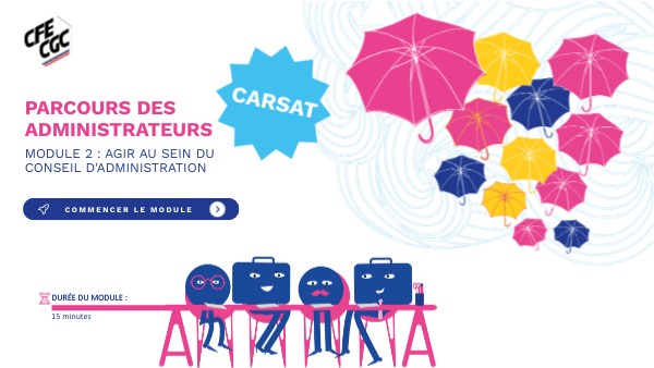 Bienvenue dans votre module consacré au conseil d’administration des caisses de retraite et de santé au travail. C’est dans cet organe de gouvernance que siègent les représentants CFE-CGC. Ensemble, nous allons décrypter ses prérogatives et son fonctionnement, le rôle de ses nombreuses commissions et des comités techniques régionaux, et comprendre comment les administrateurs peuvent agir concrètement, en matière de risque vieillesse, de risque AT/MP et pour le suivi social des assurés.