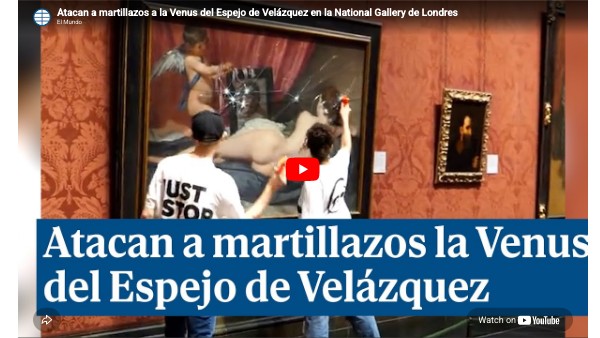 Activistas, golpean el cristal de seguridad de la Venus del Espejo de Velázquez en protesta de la apertura nuevas explotaciones petrolíferas en Gran Bretaña.