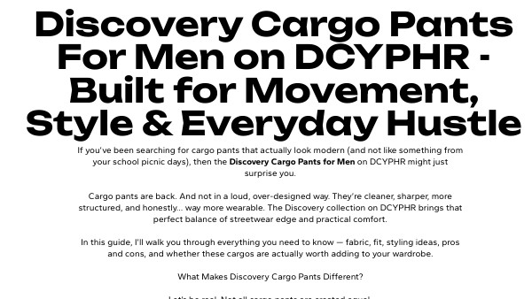 If you’ve been searching for cargo pants that actually look modern (and not like something from your school picnic days), then the Discovery Cargo Pants for Men on DCYPHR might just surprise you. Cargo pants are back. And not in a loud, over-designed way. They’re cleaner, sharper, more structured, and honestly… way more wearable. The Discovery collection on DCYPHR brings that perfect balance of streetwear edge and practical comfort. In this guide, I’ll walk you through everything you need to know — fabric, fit, styling ideas, pros and cons, and whether these cargos are actually worth adding to your wardrobe. What Makes Discovery Cargo Pants Different? Let’s be real. Not all cargo pants are created equal. Some are too baggy. Some feel stiff. Some look good online but disappoint in real life. The Discovery Cargo Pants for men are designed differently. They focus on: Clean, structured silhouette Practical pockets (without overdoing it) Comfortable stretch fabric Everyday versatility They don’t scream for attention — they just quietly level up your outfit. And that’s the kind of style that lasts. Designed for the Modern Indian Wardrobe Streetwear in India has evolved a lot in the last few years. It’s not just about oversized graphics anymore. It’s about utility, layering, neutral tones, and pieces you can mix easily. Discovery cargos fit perfectly into that vibe. You can wear them: To college For casual office settings On a road trip At the airport On weekend hangouts They sit somewhere between relaxed and refined — which makes them incredibly easy to style. Fabric & Comfort – Built for Long Days Comfort is non-negotiable when it comes to cargos. The Discovery Cargo Pants are typically made with breathable cotton blends that allow movement without feeling stiff. Some variants include stretch elements, which make sitting, walking, or riding a bike way easier. Here’s what stands out: Soft inner feel Structured outer look Durable stitching Strong pocket construction You don’t feel like you’re wearing “heavy-duty trousers.” They move with you. The Fit – Not Too Baggy, Not Too Skinny One of the biggest mistakes brands make with cargo pants is fit. Too slim? They lose the cargo vibe. Too loose? They look outdated. Discovery cargos usually come in: Slim-fit or tapered designs Mid-rise waist Clean ankle finish (sometimes cuffed) That slight taper towards the ankle makes them look modern. They pair well with sneakers, boots, and even minimal loafers. If you’re someone who likes structured outfits but still wants comfort, this fit hits the sweet spot. Pocket Game – Utility Without Bulk Cargo pants are known for pockets — but excessive pockets can ruin the look. Discovery cargos keep it smart: Two standard side pockets Two thigh cargo pockets Back pockets with secure closure The thigh pockets sit flat instead of bulging out. That detail alone makes a big difference. You can actually carry your essentials — phone, wallet, keys — without the pants looking overloaded. Popular Colors & Styling Options Discovery Cargo Pants for men usually come in versatile shades like: Olive Green Black Beige Charcoal Earth tones These colors are intentionally neutral. Why? Because they make styling effortless. 1. Casual Everyday Look White oversized tee Olive Discovery cargos White sneakers Clean. Simple. Works every time. 2. Smart Casual Vibe Black slim-fit shirt Black cargos Chelsea boots Looks sharp without trying too hard. 3. Travel Outfit Relaxed hoodie Beige cargos Chunky sneakers Comfort + style = perfect airport fit. Why Discovery Cargo Pants Are Trending There’s a reason cargos are everywhere again. The fashion cycle has moved away from super-skinny jeans and toward functional silhouettes. People want: Freedom of movement Practical storage Layer-friendly designs Discovery cargos tap into this shift perfectly. They’re practical but not clunky. Stylish but not flashy. And honestly, that balance is rare. Quality & Durability – Do They Last? Let’s talk long-term value. From stitching quality to fabric strength, Discovery Cargo Pants are built to handle regular wear. With proper washing care: Color stays intact Shape doesn’t sag easily Pockets stay structured Tip: Wash inside out and avoid harsh dryers to maintain fabric life. For daily wear pieces, durability matters. These hold up well compared to many fast-fashion options. Sizing & Fit Guide If you’re ordering online, sizing always feels like a gamble. Here’s a general idea: Stick to your regular waist size If you’re between sizes, check the measurement chart carefully If you prefer relaxed fits, consider sizing up Most Discovery cargos are true to size, but always check product-specific details on the collection page. Pros & Cons of Discovery Cargo Pants Let’s keep it honest. Pros ✔ Modern slim/tapered fit ✔ Practical pockets without bulk ✔ Comfortable stretch fabric ✔ Versatile color options ✔ Easy to style ✔ Suitable for Indian weather Cons ✖ Limited color options in some drops ✖ May feel slightly structured for those who prefer ultra-baggy fits ✖ Premium pricing compared to generic cargos Overall though? The pros easily outweigh the cons. Are Discovery Cargo Pants Worth the Price? When you buy cargos, you're not just buying pants. You're buying versatility. One pair can work across: Casual days Travel College Chill weekends Instead of owning 5 average trousers, owning 2 well-fitted cargos can actually elevate your wardrobe more. If you care about: Clean silhouettes Subtle streetwear Practical fashion Then yes — they’re worth considering. How to Take Care of Your Cargo Pants Simple care steps go a long way: Wash in cold water Avoid over-drying Turn inside out before washing Don’t overload pockets regularly Following this keeps the fabric crisp and the structure intact. Who Should Buy Discovery Cargo Pants? These are perfect for: College students who want stylish everyday we
