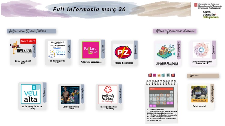 5 Formació Música7 Formació Capses d'Aprenentatge 9 i 10 Activitats del PallarsLector 11 Certamen de Lectura en veu Alta 25 Teatre en anglès. Primària 25 II Fira d'Orientació. Tria i Avança 26 Invesjove. Sort