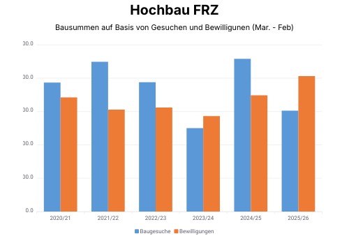 Bausummen auf Basis von Gesuchen und Bewilligunen (Mar. - Feb)