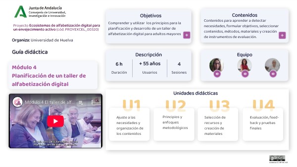 Se abordarán los principios para la selección de recursos y materiales didácticos adaptados a mayores y a la educación digital: diseño universal de aprendizaje, eficiencia y usabilidad, modularidad del contenido, duración breve... Se mostrarán algunas herramientas educativas digitales y ejemplos de uso en un Taller de Alfabetización Digital con adultos mayores. Finalmente, el alumnado discutirá sobre los criterios de una buena selección de los materiales para un determinado taller de alfabetización digital
