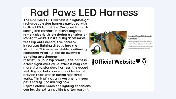 The Rad Paws LED Harness is a lightweight, rechargeable dog harness equipped with built-in LED light strips. Designed for both safety and comfort, it allows dogs to remain clearly visible during nighttime or low-light walks. Unlike bulky accessories that clip onto collars, this harness integrates lighting directly into the structure. This ensures stable positioning, consistent visibility, and no awkward dangling attachments. If safety is your top priority, this harness offers significant value. While it may cost more than a standard harness, the added visibility can help prevent accidents and provide reassurance during nighttime walks. Think of it as an investment in your pet’s safety. Considering how unpredictable roads and lighting conditions can be, the extra visibility is often worth it.