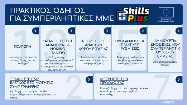 Η Πρακτική Εργαλειοθήκη για Συμπεριληπτικές ΜΜΕ είναι ένας ευρωπαϊκός πόρος που υποστηρίζει τις μικρές και μεσαίες επιχειρήσεις στην ενίσχυση των πρακτικών συμπεριληπτικής απασχόλησης. Προσφέρει δομημένη καθοδήγηση, πρακτικά εργαλεία και ένα μοντέλο αξιολόγησης ετοιμότητας για να βοηθήσει τους οργανισμούς να μεταβούν από την ευαισθητοποίηση στη βιώσιμη συμπερίληψη. Αυτή η αγγλική έκδοση παρέχει μια ευρωπαϊκή επισκόπηση των κοινών αρχών και πρακτικών. Για νομικά πλαίσια και συστήματα υποστήριξης ανά χώρα, συμβουλευτείτε τις ειδικές εθνικές εκδόσεις που είναι διαθέσιμες σε κάθε γλώσσα.