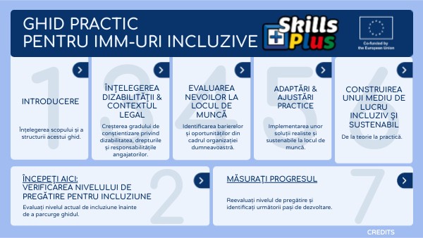 Setul de instrumente practice pentru IMM-uri incluzive este o resursă europeană care sprijină întreprinderile mici și mijlocii în consolidarea practicilor de angajare incluzive. Acesta oferă îndrumări structurate, instrumente practice și un model de evaluare a pregătirii pentru a ajuta organizațiile să treacă de la conștientizare la incluziune durabilă. Această versiune în limba engleză oferă o imagine de ansamblu europeană a principiilor și practicilor comune. Pentru cadrele juridice și sistemele de asistență specifice fiecărei țări, consultați versiunile naționale dedicate, disponibile în fiecare limbă.