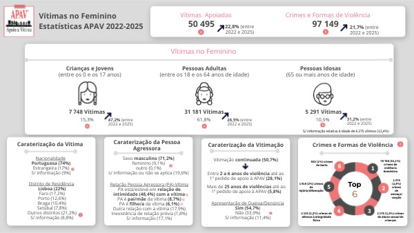 Entre 2022 e 2025, a APAV apoiou um total de 50 495 vítimas do sexo feminino, o que representou um aumento de 22,8%.
