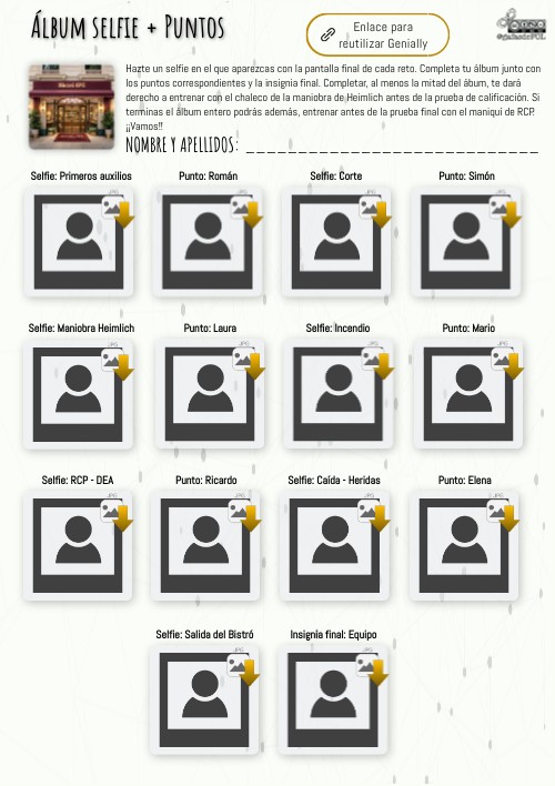 Hazte un selfie en el que aparezcas con la pantalla final de cada reto. Completa tu álbum junto con los puntos correspondientes y la insignia final. Completar, al menos la mitad del ábum, te dará derecho a entrenar con el chaleco de la maniobra de Heimlich antes de la prueba de calificación. Si terminas el álbum entero podrás además, entrenar antes de la prueba final con el maniquí de RCP. ¡¡Vamos!!