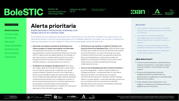 - Se dispara el uso (inseguro) de agentes de IA. Esta nueva tecnología, capaz de controlar el ordenador y hacer tareas como si fuera el usuario humano, ha puesto en el ojo del huracán a Moltbot (también conocido como OpenClaw, o anteriormente Clawdbot). Miles de usuarios están usándolo sin las medidas de seguridad adecuadas, dejando expuestas interfaces de administración sin contraseña en internet. Al tener permisos para leer archivos y acceder a aplicaciones de mensajería, ha transformado una prometedora herramienta de productividad en un "caballo de Troya" para el espionaje y el robo de datos a gran escala.