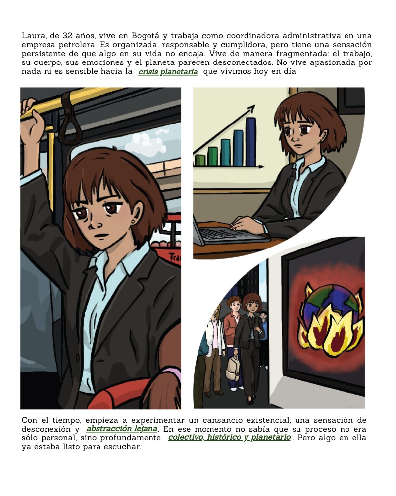 Laura, de 32 años, vive en Bogotá y trabaja como coordinadora administrativa en una empresa petrolera. Es organizada, responsable y cumplidora, pero tiene una sensación persistente de que algo en su vida no encaja. Vive de manera fragmentada: el trabajo, su cuerpo, sus emociones y el planeta parecen desconectados. No vive apasionada por nada ni es sensible hacia la crisis planetaria que vivimos hoy en día