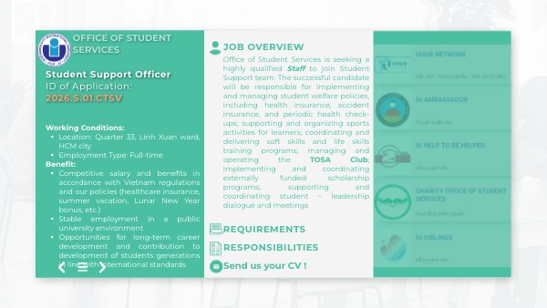 Phòng Công tác Sinh viên có nhu cầu tuyển dụng Chuyên viên làm việc tại bộ phận Chăm sóc người học. Ứng viên trúng tuyển sẽ chịu trách nhiệm triển khai và quản lý các chính sách phúc lợi cho sinh viên (bảo hiểm y tế, bảo hiểm tai nạn, khám sức khỏe định kỳ), tổ chức hoạt động thể thao, đào tạo kỹ năng mềm – kỹ năng sống, quản lý câu lạc bộ TOSA, kết nối học bổng ngoài ngân sách, hỗ trợ đối thoại sinh viên – lãnh đạo ...