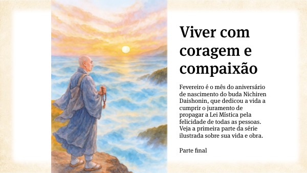 Fevereiro é o mês do aniversário de nascimento do buda Nichiren Daishonin, que dedicou a vida a cumprir o juramento de propagar a Lei Mística pela felicidade de todas as pessoas. Veja a primeira parte da série ilustrada sobre sua vida e obra.