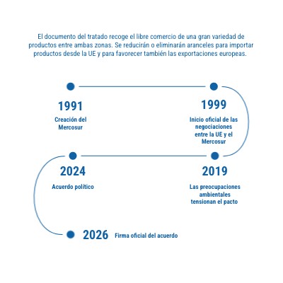 La relación entre la UE y el Mercosur se remonta a 1999, cuando entró en vigor el Acuerdo Marco Interregional de Cooperación. Desde entonces, las negociaciones de un acuerdo de asociación entre la UE y el Mercosur han atravesado diferentes etapas.