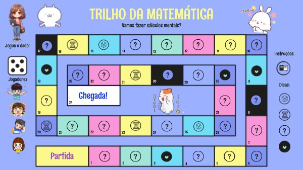 A partir da casa inicial, terá que lançar os dados e responder às perguntas. Quando a resposta estiver errada, sua vez passará e deve retroceder 1 casa. Leia com atenção as informações dos diferentes símbolos a cada jogada. O vencedor será aquele que conseguir chegar primeiro ao ponto de chegada. Boa sorte!
