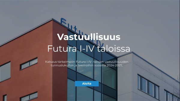 Katsaus tärkeimpiin Futura I-IV -talojen vastuullisuuden tunnuslukuihin ja teemoihin vuosina 2024-2025.