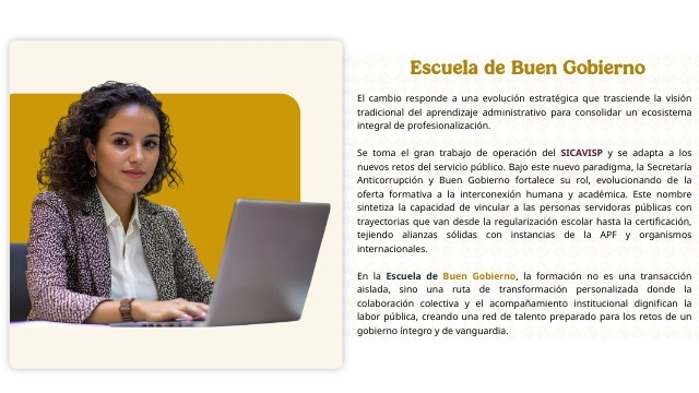 El cambio responde a una evolución estratégica que trasciende la visión tradicional del aprendizaje administrativo para consolidar un ecosistema integral de profesionalización. Se toma el gran trabajo de operación del SICAVISP y se adapta a los nuevos retos del servicio público. Bajo este nuevo paradigma, la Secretaría Anticorrupción y Buen Gobierno fortalece su rol, evolucionando de la oferta formativa a la interconexión humana y académica. Este nombre sintetiza la capacidad de vincular a las personas servidoras públicas con trayectorias que van desde la regularización escolar hasta la certificación, tejiendo alianzas sólidas con instancias de la APF y organismos internacionales. En la Escuela de Buen Gobierno, la formación no es una transacción aislada, sino una ruta de transformación personalizada donde la colaboración colectiva y el acompañamiento institucional dignifican la labor pública, creando una red de talento preparado para los retos de un gobierno íntegro y de vanguardia.