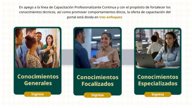 En apego a la línea de Capacitación Profesionalizante Continua y con el propósito de fortalecer los conocimientos técnicos, así como promover comportamientos éticos, la oferta de capacitación del portal está divida en tres enfoques: