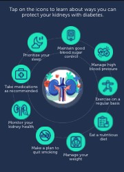 Tap on the icons to learn about ways you can protect your kidneys with diabetes.
