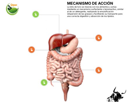 La bilis de toro se mezcla con los alimentos y actúa mediante un mecanismo surfactante o tensioactivo, similar al de un detergente, realizando la emulsificación (dispersión de las grasas) y facilitando su transporte para una correcta digestión y absorción de los lípidos.