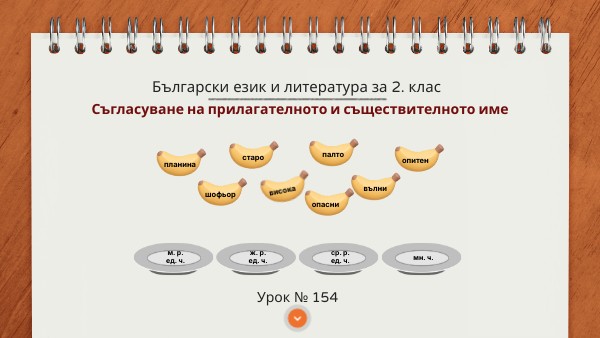 Съгласувай по род и число прилагателното със съществителното име. Във всяка чиния постави по два банана.
