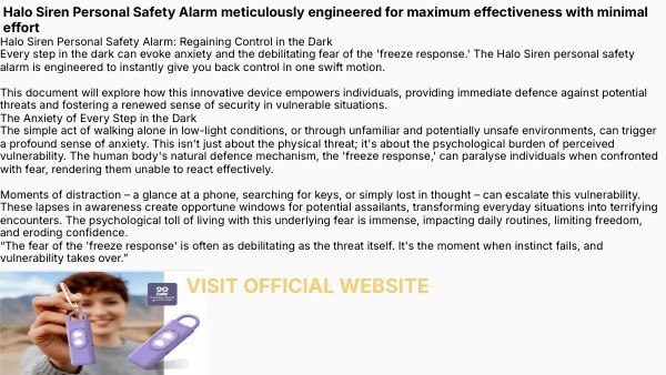Halo Siren Personal Safety Alarm: Regaining Control in the Dark Every step in the dark can evoke anxiety and the debilitating fear of the 'freeze response.' The Halo Siren personal safety alarm is engineered to instantly give you back control in one swift motion. This document will explore how this innovative device empowers individuals, providing immediate defence against potential threats and fostering a renewed sense of security in vulnerable situations. The Anxiety of Every Step in the Dark The simple act of walking alone in low-light conditions, or through unfamiliar and potentially unsafe environments, can trigger a profound sense of anxiety. This isn't just about the physical threat; it's about the psychological burden of perceived vulnerability. The human body's natural defence mechanism, the 'freeze response,' can paralyse individuals when confronted with fear, rendering them unable to react effectively. Moments of distraction – a glance at a phone, searching for keys, or simply lost in thought – can escalate this vulnerability. These lapses in awareness create opportune windows for potential assailants, transforming everyday situations into terrifying encounters. The psychological toll of living with this underlying fear is immense, impacting daily routines, limiting freedom, and eroding confidence. “The fear of the 'freeze response' is often as debilitating as the threat itself. It's the moment when instinct fails, and vulnerability takes over.”