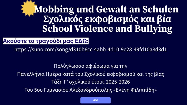 Στο πλαίσιο του μαθήματος των Γερμανικών στη Γ΄ Γυμνασίου υλοποιήθηκε πρότζεκτ με θέμα τον σχολικό εκφοβισμό, σε σύνδεση με την Πανελλήνια Ημέρα κατά του Σχολικού Εκφοβισμού και το Σχέδιο Δράσης του σχολείου «Σχέσεις μεταξύ μαθητών». Οι μαθητές, μέσα από διαδικτυακή έρευνα στη γερμανική γλώσσα, συλλέγουν και ερμηνεύουν αυθεντικό υλικό (αφίσες, λογότυπα καμπανιών, σχεδιαγράμματα κ.ά.), μεταφράζουν βασικά μηνύματα στην ελληνική και στην αγγλική με χρήση των Νέων Τεχνολογιών και συνεργασία με τους εκπαιδευτικούς της Αγγλικής Γλώσσας. Παρουσιάζουν τα έργα τους σε ψηφιακή μορφή. Η εργασία εμπλουτίζεται με ποιήματα και τραγούδια σχετικά με το θέμα. Οι στίχοι των μαθητών/τριών μελοποιήθηκαν μέσω SUNO AI. Μπορείτε να ακούσετε το τραγούδι εδώ: https://suno.com/song/d310b6cc-4abb-4d10-9e28-49fd10a8d3d1 Το παρόν προϊόν δημοσιεύεται στην ιστοσελίδα του σχολείου, συμβάλλοντας στην ευαισθητοποίηση και την ενίσχυση θετικών σχέσεων μεταξύ των μαθητών στο σύνολο της σχολικής κοινότητας. Υπό την επίβλεψη της εκπαιδευτικού Αθανασίας Παπαδοπούλου, Κλάδου ΠΕ07, Γερμανικής Γλώσσας & Φιλολογίας