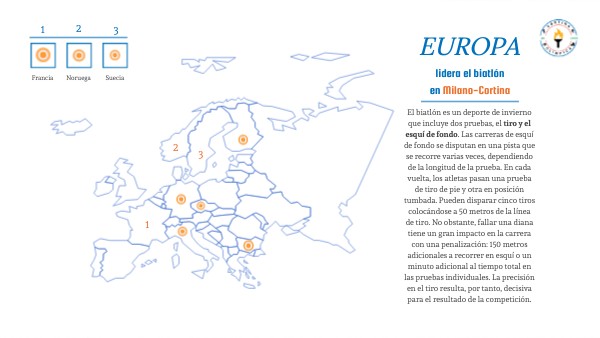 El biatlón es un deporte de invierno que incluye dos pruebas, el tiro y el esquí de fondo. Las carreras de esquí de fondo se disputan en una pista que se recorre varias veces, dependiendo de la longitud de la prueba. En cada vuelta, los atletas pasan una prueba de tiro de pie y otra en posición tumbada. Pueden disparar cinco tiros colocándose a 50 metros de la línea de tiro. No obstante, fallar una diana tiene un gran impacto en la carrera con una penalización: 150 metros adicionales a recorrer en esquí o un minuto adicional al tiempo total en las pruebas individuales. La precisión en el tiro resulta, por tanto, decisiva para el resultado de la competición.