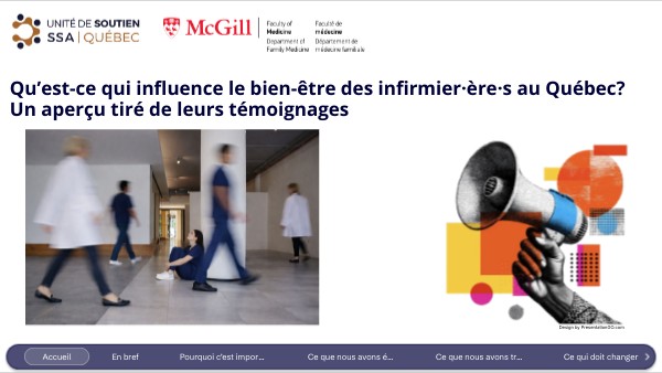 Nguyen, D. V. T., Bush, P. L., Lambert, S. D., & Salimi, D. (2026).Qu’est-ce qui influence le bien-être des infirmier·ère·s au Québec?Un aperçu tiré de leurs témoignages [présentation interactive]. Genially. https://view.genially.com/69a703fa1f9c02b2dc3d4c63