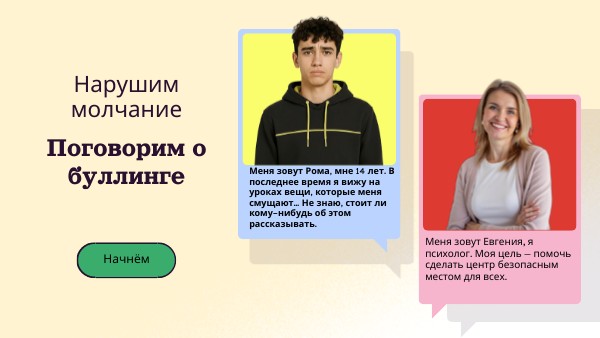 Рома стал свидетелем того, как его одноклассник Марк постоянно подвергается насмешкам со стороны других учеников. Хотя поначалу это казалось «шутками», он заметил, что Марк становится все более замкнутым и грустным. Рома решил поговорить с Евгенией, школьным психологом, чтобы выяснить, действительно ли это издевательства и что он может сделать.
