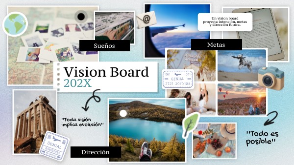 Plantilla visual tipo Vision Board para organizar ideas, objetivos y conceptos de forma estratégica y creativa. Ideal para proyectos de diseño, marketing, branding o planificación académica. Permite estructurar metas, inspiración y prioridades.