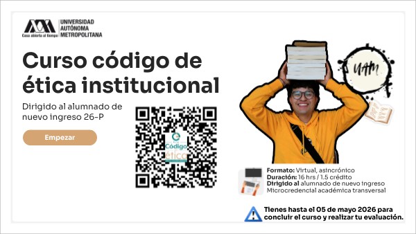 Este curso busca promover y sensibilizar al alumnado de nuevo ingreso a la UAM los valores y principios institucionales sustentados en el código de ética para incorporarlos y preservarlos en el desarrollo de su formación académica, fomentando una cultura de paz.