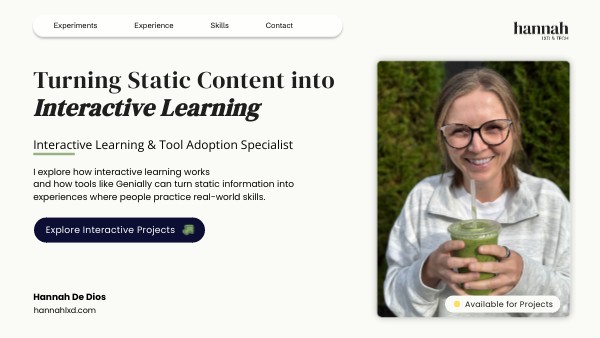 Founder — Hannah LXD Exploring how interactive learning works and how tools like Genially can transform static information into engaging learning experiences. Focus Areas • Building interactive learning experiments using Genially • Testing interaction mechanics, scenarios & challenges • Creating reusable templates for training and onboarding • Winner — Genially Final Game Competition 2025