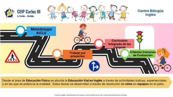 Desde el área de Educación Física se aborda la Educación Vial en Inglés a través de actividades lúdicas, experienciales y en las que se potencia la oralidad. Estas tareas se desarrollan a través de resolución de retos en equipos en el patio.