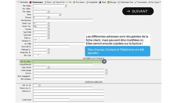 Les différentes adresses sont récupérées de la fiche client, mais peuvent être modifiées ici. Elles seront ensuite copiées sur la facture !