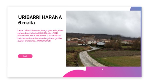 Laster Uribarri Haranara joango gara pista jolasa egitera. Zuen taldeko KOLOREA eta 1.PISTA eskuratzeko, KODE SEKRETUA (LAU ZENBAKI) lortu behar duzue, horretarako galdera guztiak ZUZEN erantzunez. ANIMOOOOO!!!