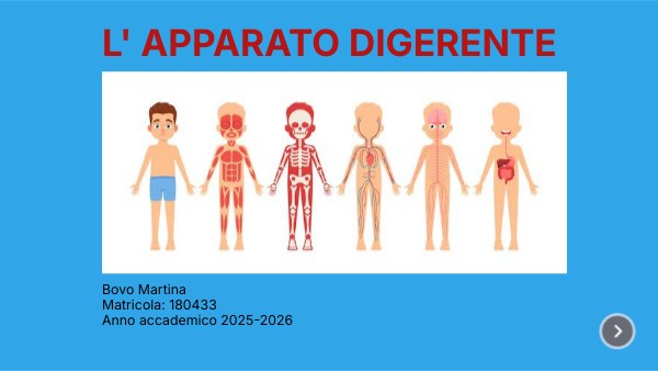 La presentazione è pensata per una classe quinta della scuola primaria e ha l'obiettivo di fornire informazioni sull'apparato digerente in modo semplice e interattivo per permetterne la comprensione a tutti gli studenti. OBIETTIVO DI RIFERIMENTO osservare e prestare attenzione al funzionamento del proprio corpo (fame, sete, dolore, movimento, freddo, caldo, ecc) per riconoscerlo come organismo complesso, proponendo modelli elementari del suo funzionamento.