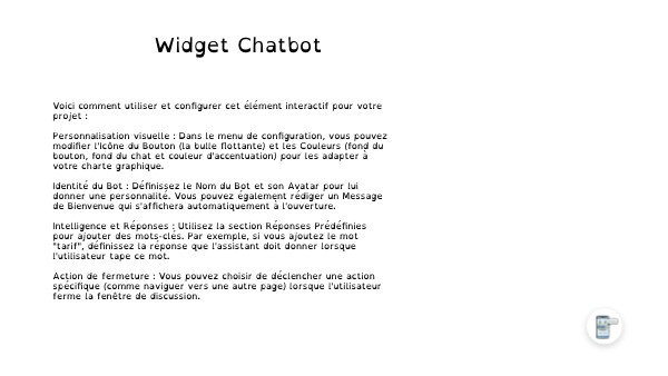 Voici comment utiliser et configurer cet élément interactif pour votre projet : Personnalisation visuelle : Dans le menu de configuration, vous pouvez modifier l'Icône du Bouton (la bulle flottante) et les Couleurs (fond du bouton, fond du chat et couleur d'accentuation) pour les adapter à votre charte graphique. Identité du Bot : Définissez le Nom du Bot et son Avatar pour lui donner une personnalité. Vous pouvez également rédiger un Message de Bienvenue qui s'affichera automatiquement à l'ouverture. Intelligence et Réponses : Utilisez la section Réponses Prédéfinies pour ajouter des mots-clés. Par exemple, si vous ajoutez le mot "tarif", définissez la réponse que l'assistant doit donner lorsque l'utilisateur tape ce mot. Action de fermeture : Vous pouvez choisir de déclencher une action spécifique (comme naviguer vers une autre page) lorsque l'utilisateur ferme la fenêtre de discussion.