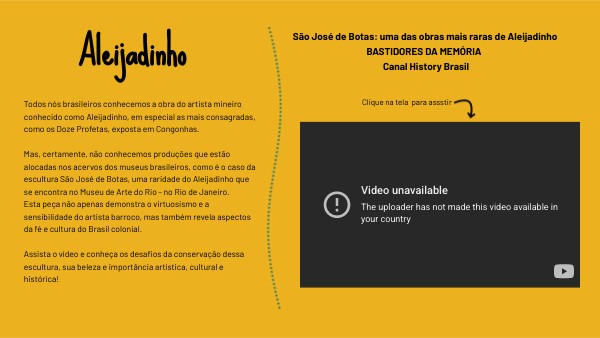 Todos nós brasileiros conhecemos a obra do artista mineiro conhecido como Aleijadinho, em especial as mais consagradas, como os Doze Profetas, exposta em Congonhas. Mas, certamente, não conhecemos produções que estão alocadas nos acervos dos museus brasileiros, como é o caso da escultura São José de Botas, uma raridade do Aleijadinho que se encontra no Museu de Arte do Rio - no Rio de Janeiro. Esta peça não apenas demonstra o virtuosismo e a sensibilidade do artista barroco, mas também revela aspectos da fé e cultura do Brasil colonial. Assista o vídeo e conheça os desafios da conservação dessa escultura, sua beleza e importância artística, cultural e histórica!
