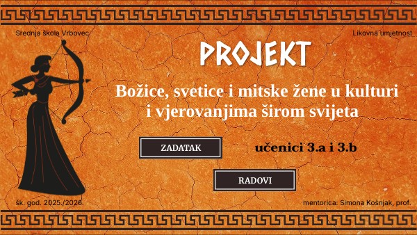 Učenici 3.a i 3.b razreda na nastavi Likovne umjetnosti radili su projektni zadatak pod nazivom „Božice, svetice i mitske žene u kulturi i vjerovanjima širom svijeta“. Učenici su bili podijeljeni u skupine prema tematskim kategorijama koje su obuhvaćale ženske likove povezane s vlašću i poretkom, zaštitom i životom, ratom i smrću te ljubavlju i mudrošću. Svaka skupina izradila je zajedničku prezentaciju u digitalnom alatu Canva. U okviru zadatka učenici su: - istražili podrijetlo odabranog lika na temelju mitologije, legende ili religijske tradicije - objasnili iz koje kulture ili mitologije potječe - opisali na koji se način taj lik štovao ili kakvu je ulogu imao u vjerovanjima određene zajednice Poseban dio rada odnosio se na umjetnički aspekt teme. Učenici su analizirali jedan primjer iz likovne umjetnosti (slikarstvo ili kiparstvo) te objasnili na koji je način odabrani lik prikazan u umjetnosti i koje su njegove prepoznatljive ikonografske značajke. Ovim projektom učenici su povezivali znanja iz umjetnosti, povijesti i mitologije te razvijali istraživačke i prezentacijske vještine.