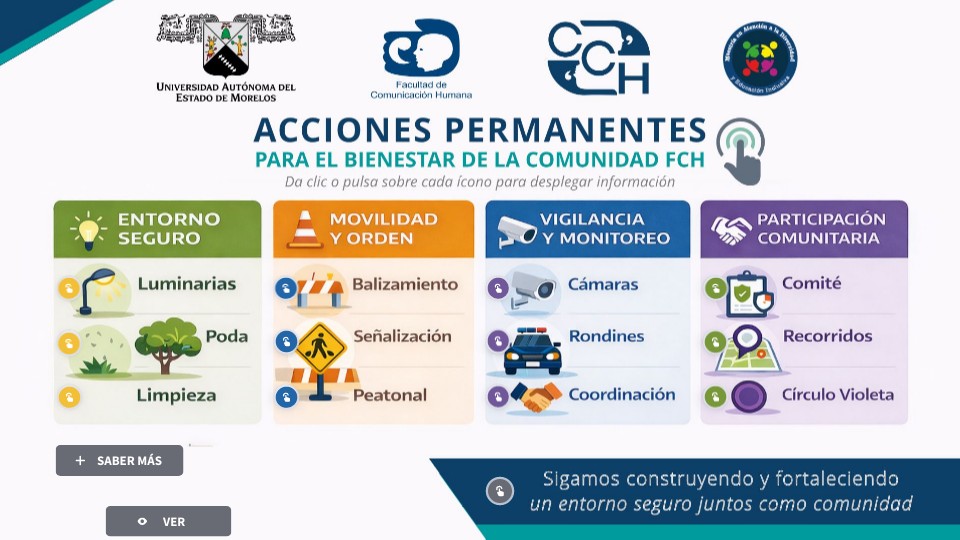 En la FCH la excelencia académica y la calidez humana que nos distingue solamente se pueden lograr con trabajo colaborativo y acciones concretas que nos permitan transitar y permanecer en entornos seguros. Por ello, reafirmamos el compromiso con la mejora continua de nuestra Unidad Académica y con la gestión interinstitucional para la conservación de los trayectos que recorremos día con día.