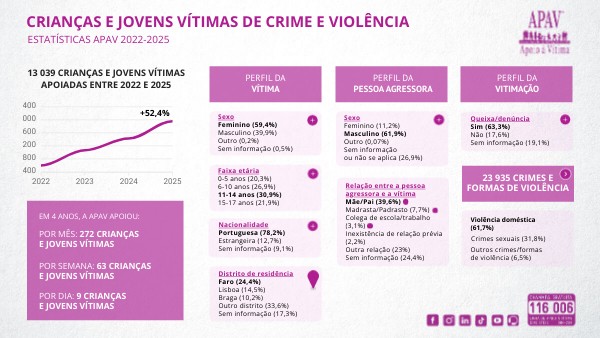 Entre 2022 e 2025, chegou ao conhecimento da APAV um total de 13 386 pessoas agressoras de crianças e jovens (aumento de 59,8%). Destas pessoas agressoras, 8 291 (61,9%) eram do sexo masculino (aumento de 79,1%). e 1 503 (11,2%) do sexo feminino (aumento de 104,8%).