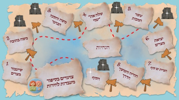 אתם צועדים על המפה בעקבות סיפור יציאת בני ישראל ממצרים. צעדו על הקלפים לפי סדר המספרים. לחצו על הקלף וקראו את המידע המופיע בו. ענו על השאלה או בצעו את המשימה בעקבותיו .בין הקלפים מפוזרים סלעים, בהם יש שירים, סרטונים ועוד