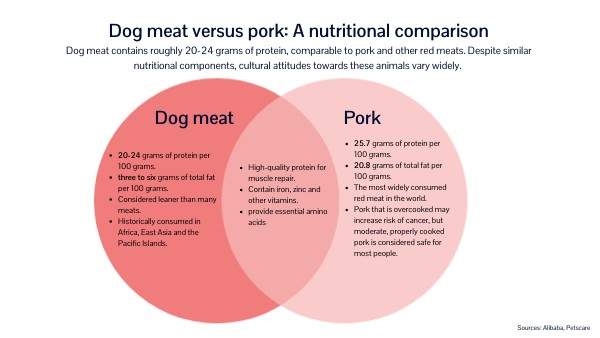 Dog meat contains roughly 20-24 grams of protein, comparable to pork and other red meats. Despite similar nutritional components, cultural attitudes towards these animals vary widely.