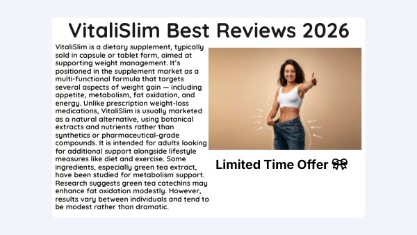 VitaliSlim is a dietary supplement, typically sold in capsule or tablet form, aimed at supporting weight management. It’s positioned in the supplement market as a multi-functional formula that targets several aspects of weight gain — including appetite, metabolism, fat oxidation, and energy. Unlike prescription weight-loss medications, VitaliSlim is usually marketed as a natural alternative, using botanical extracts and nutrients rather than synthetics or pharmaceutical-grade compounds. It is intended for adults looking for additional support alongside lifestyle measures like diet and exercise. Some ingredients, especially green tea extract, have been studied for metabolism support. Research suggests green tea catechins may enhance fat oxidation modestly. However, results vary between individuals and tend to be modest rather than dramatic.