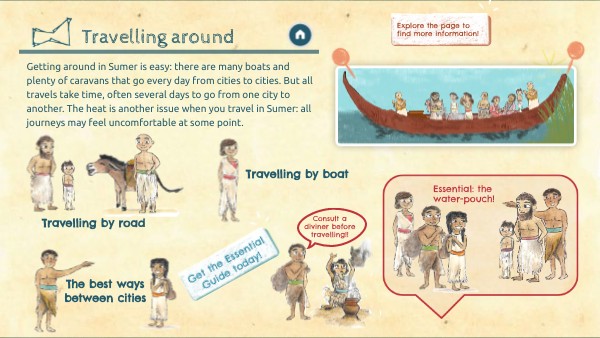 Getting around in Sumer is easy: there are many boats and plenty of caravans that go every day from cities to cities. But all travels take time, often several days to go from one city to another. The heat is another issue when you travel in Sumer: all journeys may feel uncomfortable at some point.