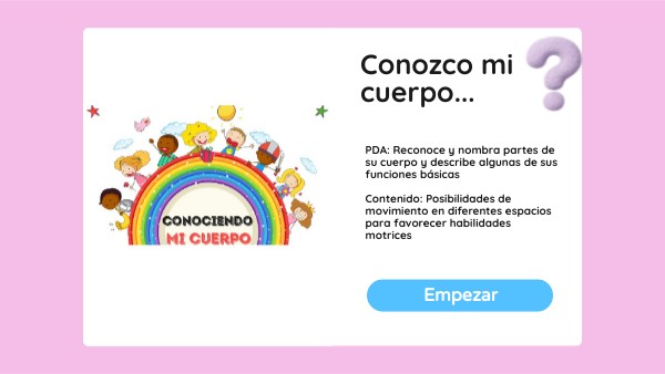 PDA: Reconoce y nombra partes de su cuerpo y describe algunas de sus funciones básicas Contenido: Posibilidades de movimiento en diferentes espacios para favorecer habilidades motrices