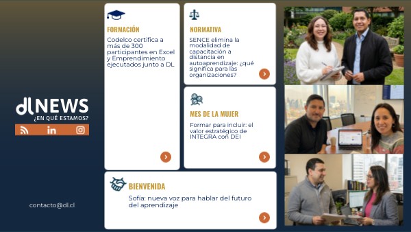 Damos la bienvenida a Sofía, nuestra nueva relacionadora pública virtual, quien llega para impulsar la conversación sobre el impacto del aprendizaje en la estrategia de negocios. A través de las redes, compartirá contenidos, reflexiones y tendencias sobre aprendizaje, innovación, transformación organizacional y desarrollo de personas. Su rol será visibilizar cómo la formación aporta al fortalecimiento de capacidades, la cultura organizacional y el cumplimiento de objetivos estratégicos. Con Sofía, DL refuerza su compromiso con una mirada actual e innovadora del aprendizaje, conectando personas, estrategia y crecimiento en las organizaciones.