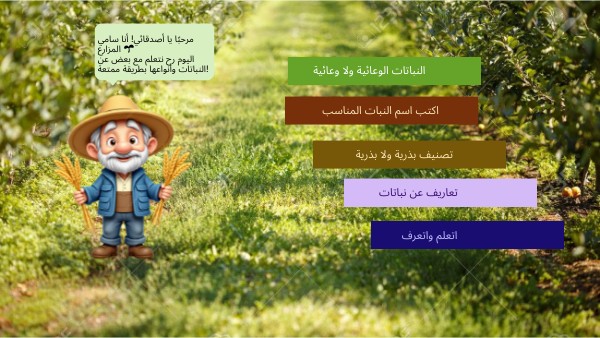 مرحبًا يا أصدقائي! أنا سامي المزارع 🌱 اليوم رح نتعلم مع بعض عن النباتات وأنواعها بطريقة ممتعة!